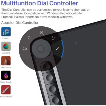 Radial Controller Protocol is supported with or without the Driver installed.It functions differently in different drawing program.Page Scrolling,Zoom in/out,change the brush. You can also customize it to your preference.