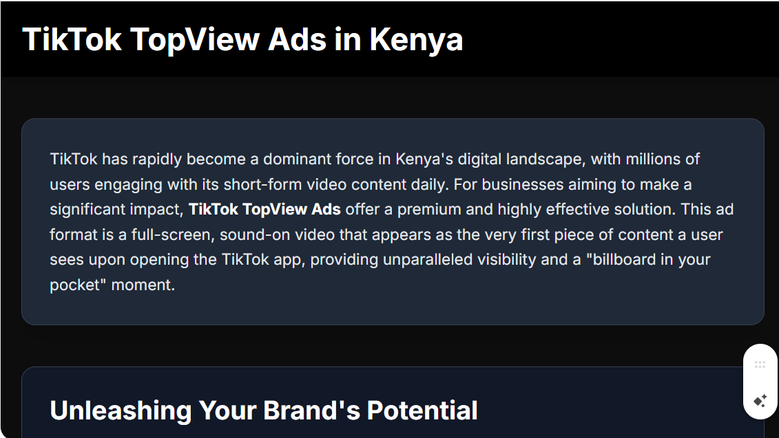 TikTok has rapidly become a dominant force in Kenya’s digital landscape, with millions of users engaging with its short-form video content daily. For businesses aiming to make a significant impact, TikTok TopView Ads offer a premium and highly effective solution. This ad format is a full-screen, sound-on video that appears as the very first piece of content a user sees upon opening the TikTok app, providing unparalleled visibility and a “billboard in your pocket” moment.